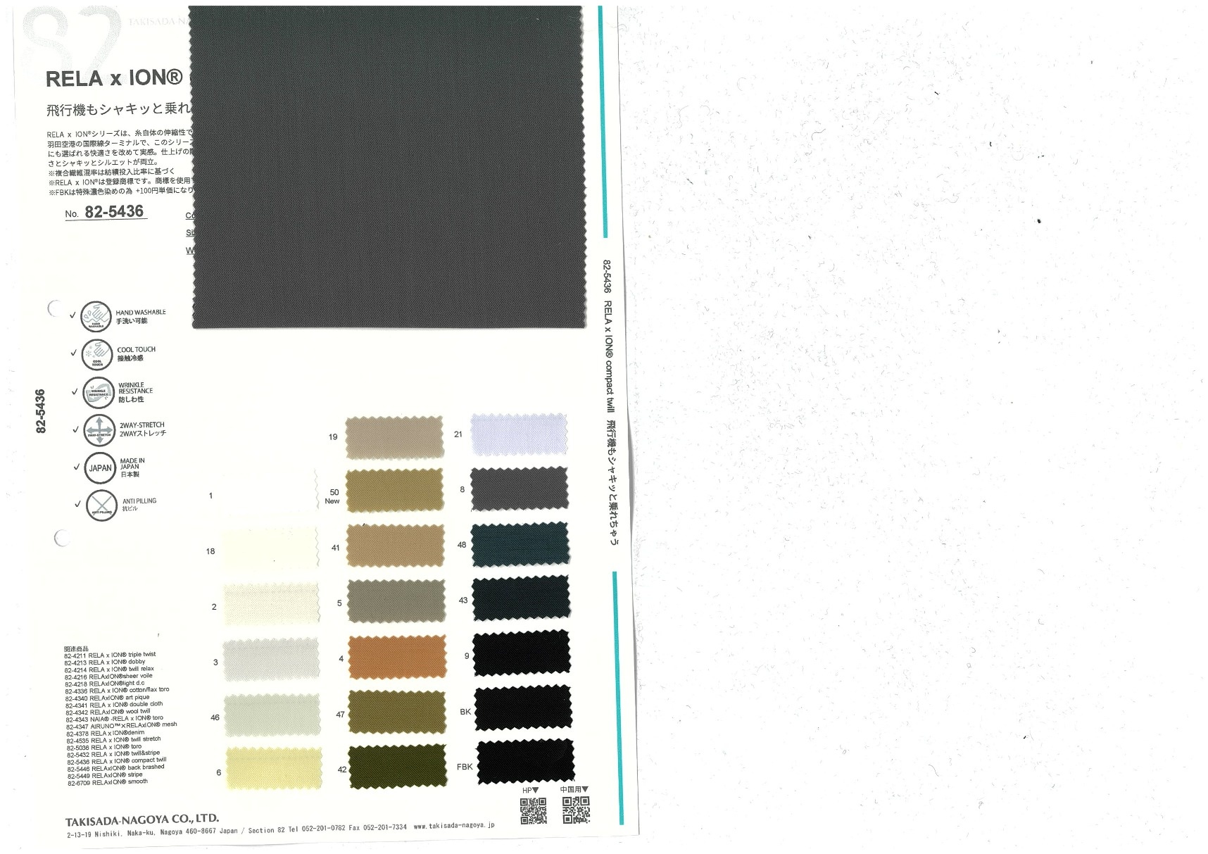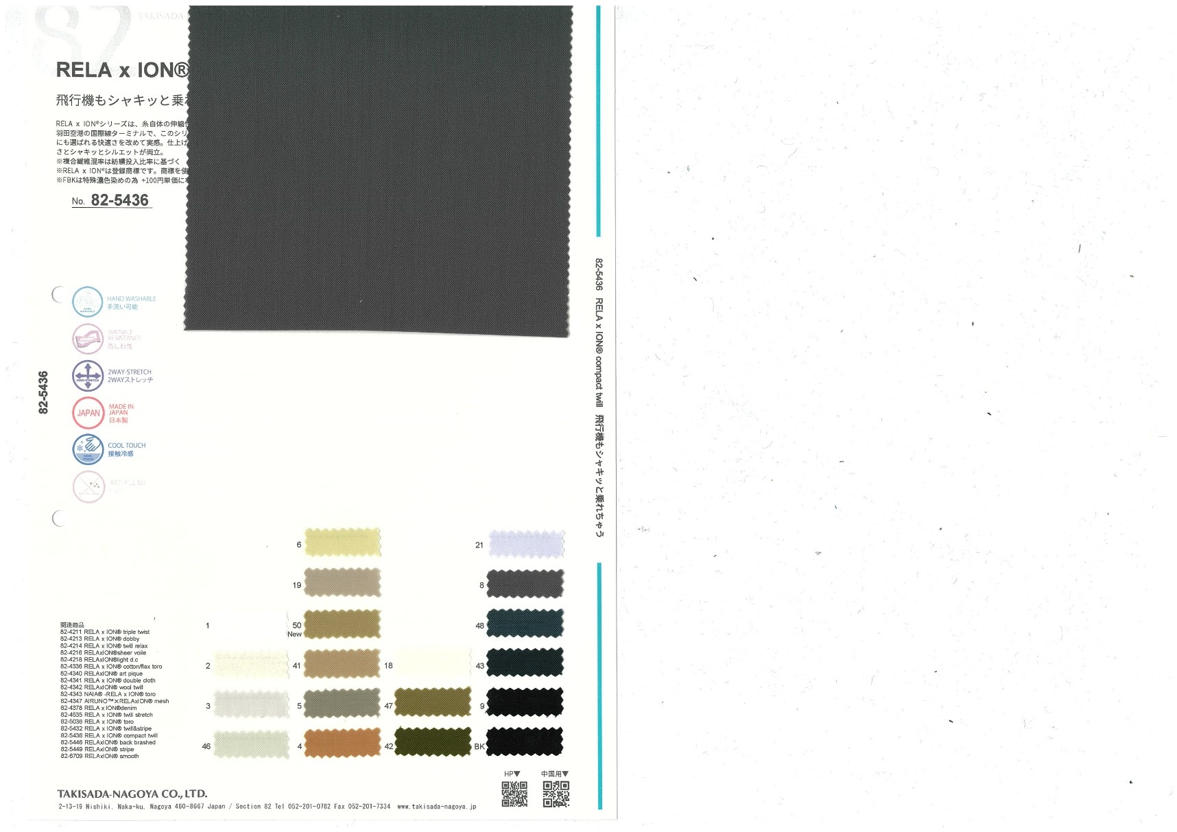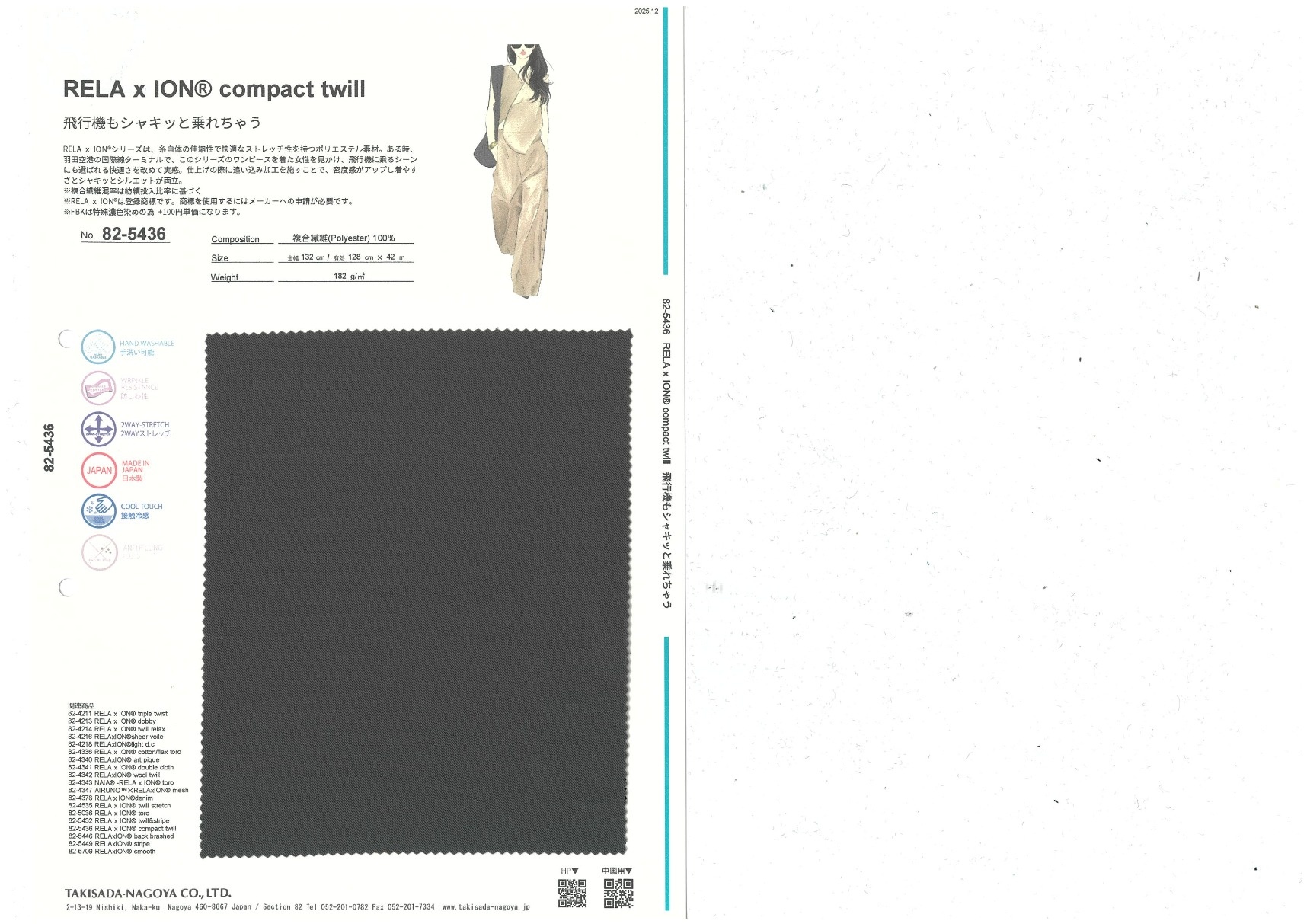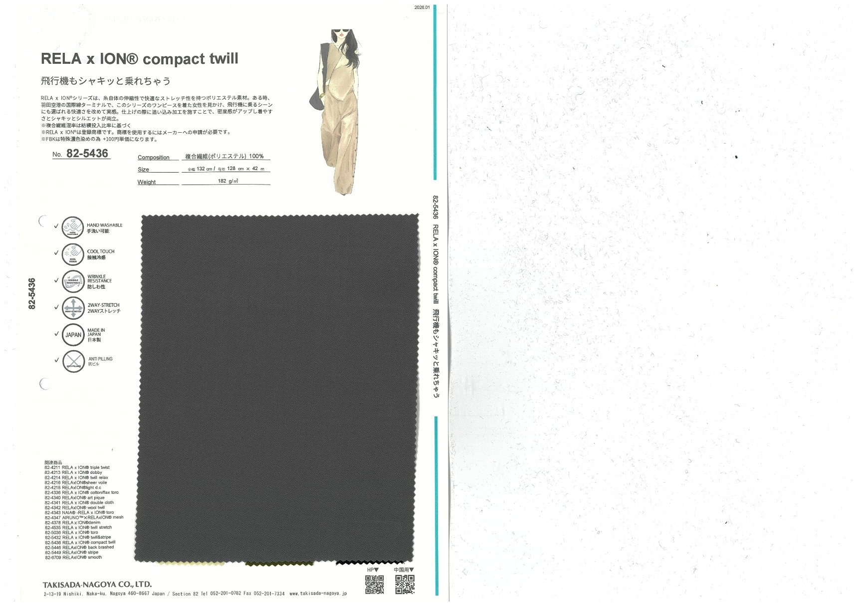 RELAxION is a series of polyester materials with comfortable stretch achieved by using stretchy yarn. Once, we saw a lady in a RELAxION dress at Haneda Airport's International Terminal. Seeing that someone had even chosen to wear it on an airplane showed us again just how comfortable it is. The weave is tightened in the finish to increase its density, achieving both comfort and sharp silhouettes.