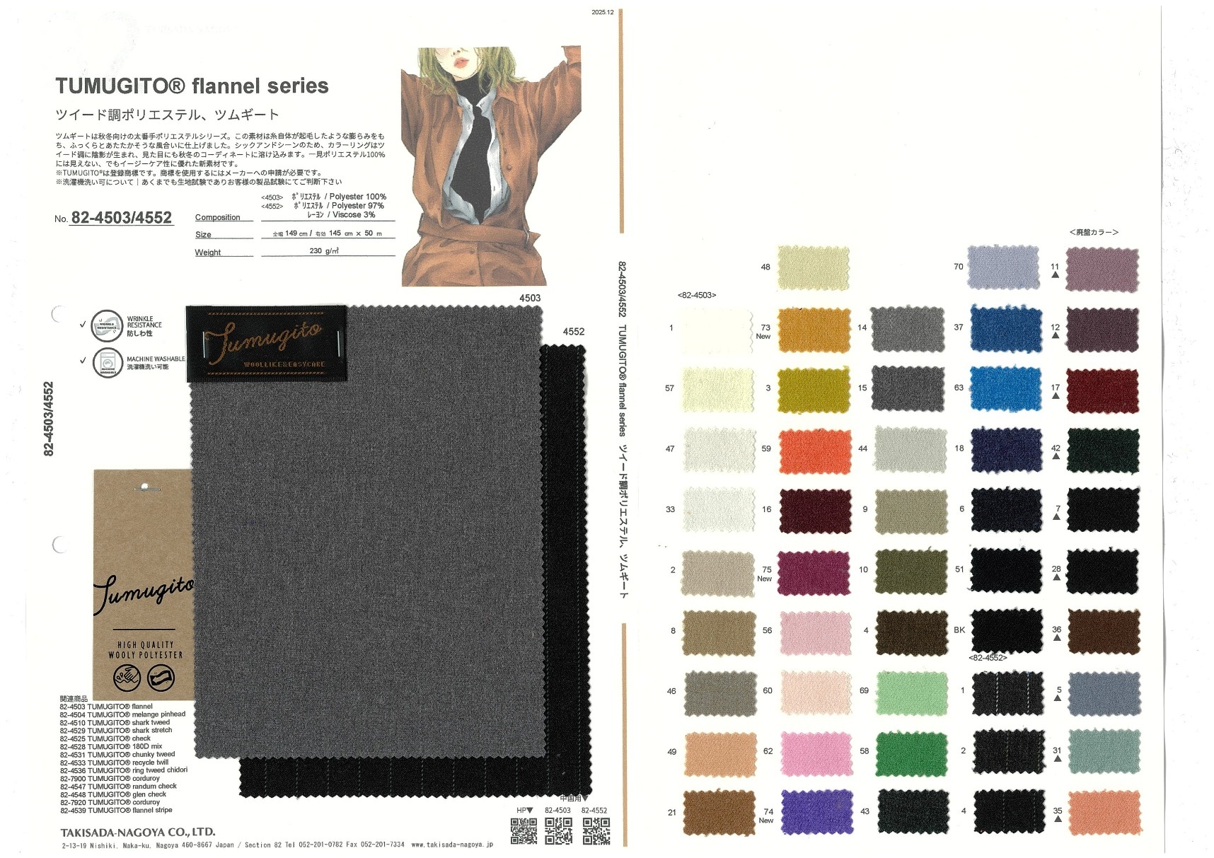 TUMUGITO is a series of low-yarn-count polyesters for autumn and winter. The yarn itself has a raised, voluminous feel, making the material fluffy and warm to the touch. The thick and thin yarn creates shading in the tweed-like pattern, so the appearance will also blend well into autumn and winter outfits. This is a new material that doesn't look like 100% polyester at a glance, but is still extremely easy to care for.