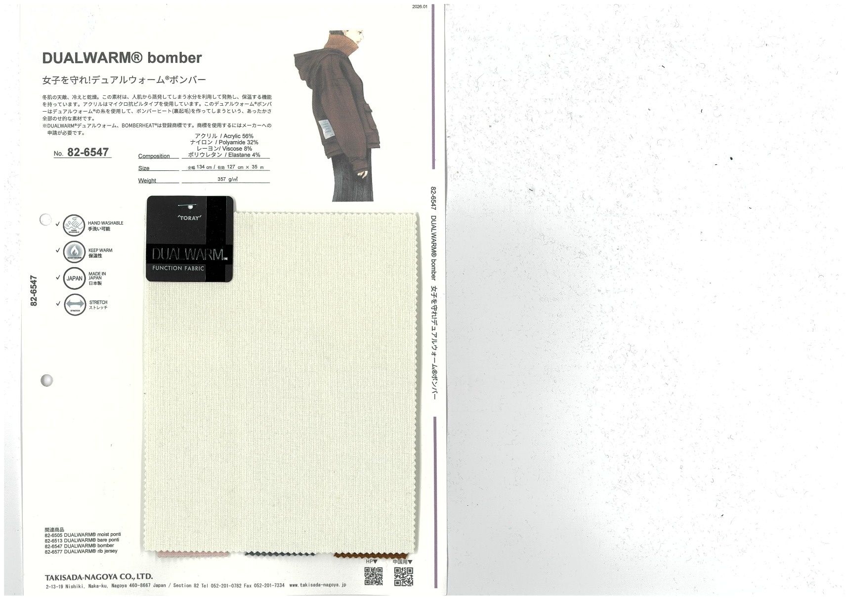 Skin's worst enemies in winter are the cold and dry. This material uses moisture from the skin to generate and retain heat. It's made with a micro pill-resistant acrylic fiber. DUALWARM Bomber is a super-warm material because DUALWARM yarn is used to make BOMBERHEAT (raised reverse side).