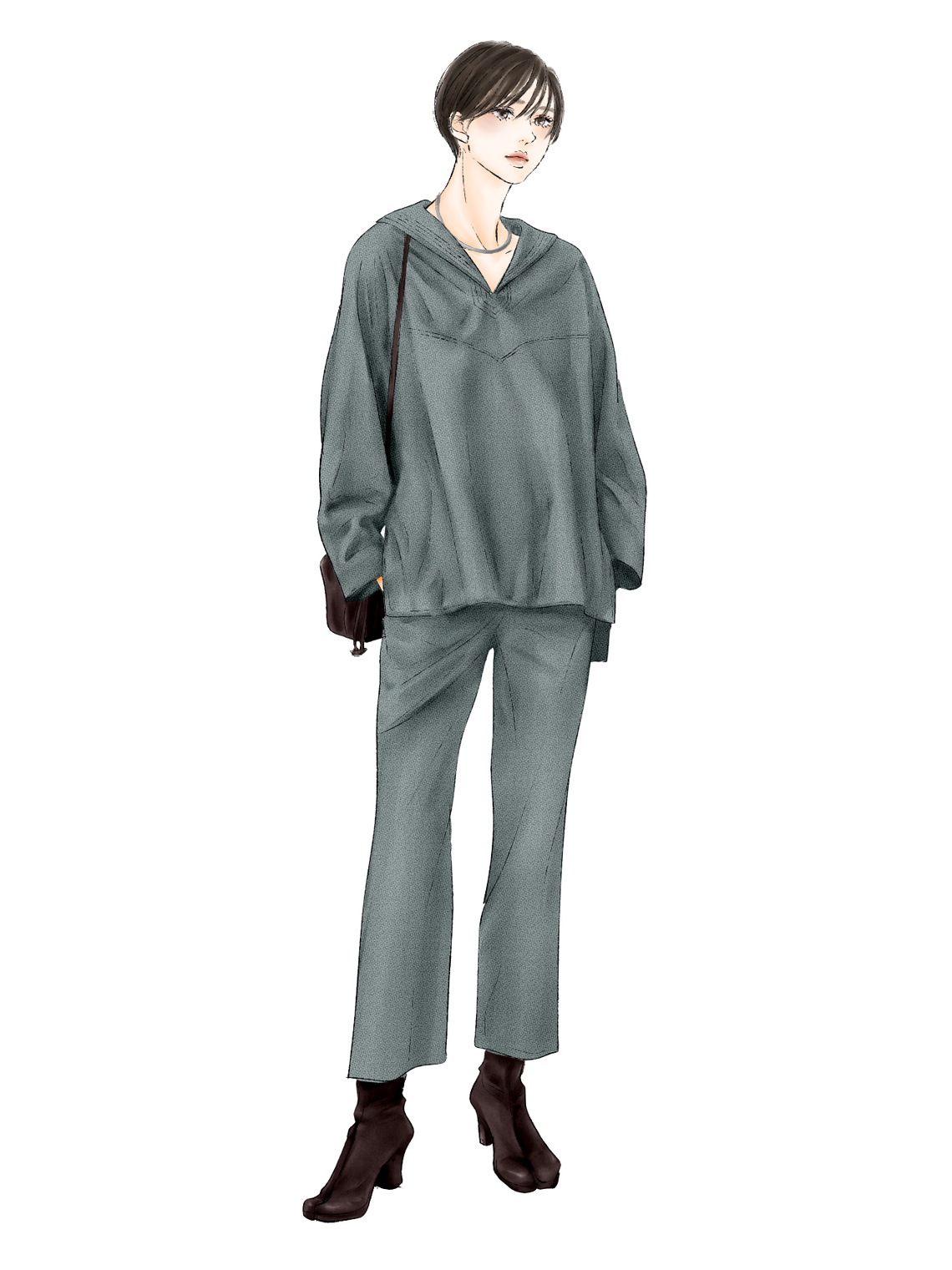 カジュアル感のつよいミルドフェイスを活かしてトレンドアイテムに挑戦。ちくちく感のないやわらかい起毛感を素肌で味わえるメキシカンパーカーと裏なしのクロップトフレアパンツ。梳毛=スーツ、リクルート等の堅いイメージを打破。