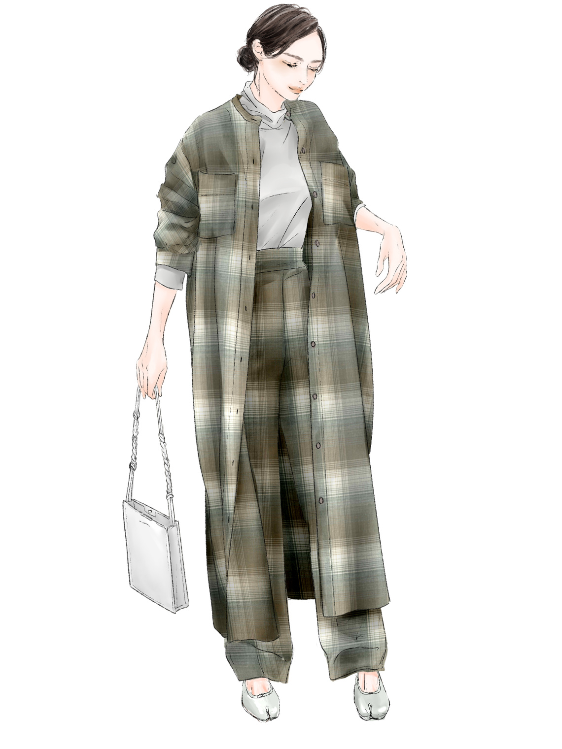 薄手を活かしたたっぷりとロング丈のシャツワンピースとワイドパンツで、ネルシャツのようなレトロ感をキレイ目に着こなして。閉じればワンピース風、あければ羽織になるデザインは、気温の不安定な時期に頼れる一枚に。薄くても肌離れがよく色次第で春買って秋も、秋買って春も着られる汎用性が◎。