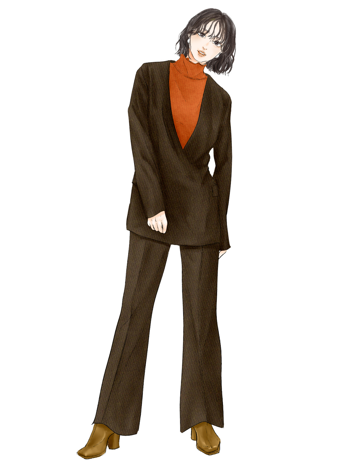 一見ハードそうな表面感でも、ANASTASIAのストレッチ性と肌触りを活かして、着心地は洋品感覚できちんと感を出せる、プルオーバータイプのジャケットで仕事服にも遊び心を。センタープレスを利かせたフレアパンツで脚長効果も期待。