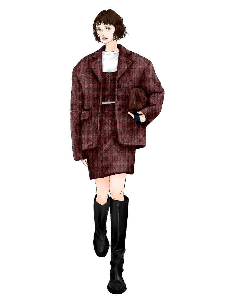 ざっくり感がリズミカルなスライバーやロービングをベースに、表面をプレスし、かつボンディング加工を組み合わせることで、見た目と相反する構築的なシルエットを可能にし、驚きの軽さが実現。レトロ×スポーティーが今の気分にぴったり。