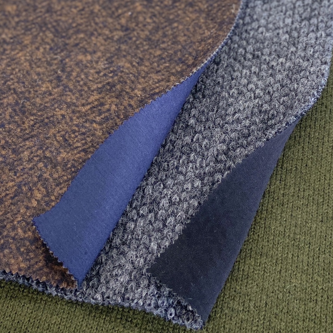 様々な組織を複雑に組み合わせた、織地の豊かな表現力が楽しい。奥行きのあるメランジカラーが人気のツイード調合繊をベースに、糸の浮きと組織の組み合わせによりまるでビンテージのインターシャのような表情に。