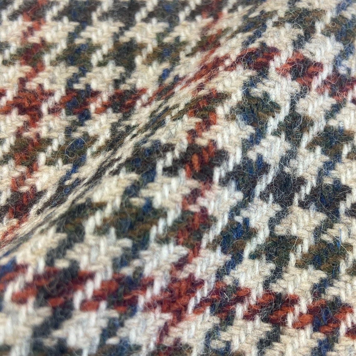 ツイーディーな太番手感を楽しむ多本子撚りのチェックは、今までよりも少しグラフィカルでアートな気分を盛り上げる。古着由来のリサイクルウールならではのカラートップを何色も組み合わせて作る、カラフルでありながら落ち着いたトーンが魅力。