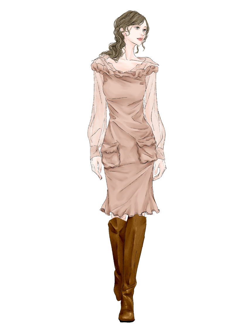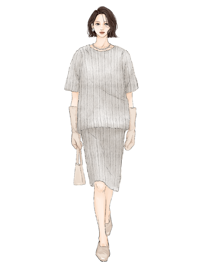 大人っぽさと可愛さのバランスが絶妙なフェティッシュムードは落ち着いた雰囲気やクラシックな方向に広がり継続。丈感がミニ丈からミディ丈へシフトすることで必要になる軽さとストレッチ性、また、センシュアルなデザインを媚びずに纏うためのメモリー感と光沢度合は、洗練×モード感漂うストレッチタフタにおまかせ。ストレッチ性の強いハイマルチの柔らかなポリエステルを高密度に織り上げることで軽さとメモリー感が強まり、体にフィットしながらもパリッとしたモードな構築性素材に。また、セミダルのタフタで作るマットな光沢感もシャープさを強調。下に重ねるブラウスは思いきりフェミニンなジョーゼットやシアードレープ素材を選びタフタとのコントラストで抜け感を。