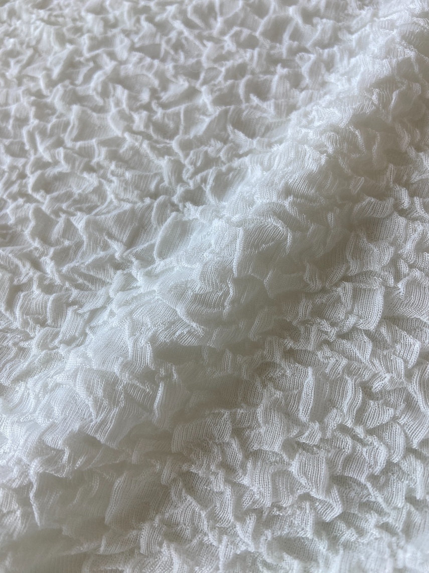 美しく広がるAラインシルエットをしっかり構築できるボリューミーなハリ感と、マーメイドラインをドラマティックに強調した重厚感を感じる新たなスカートデザインに必要な軽さは、薄いコーティング素材とジャカードジャージーを貼り合わせることで同時に実現。また、パンチングで穴をあけ、グラフィカルなデザイン性と通気と軽量化の機能性をアップさせたものや、プリント、エンボス、サンド加工により少しカジュアルダウンした汎用性の高いものまで幅を広げて。