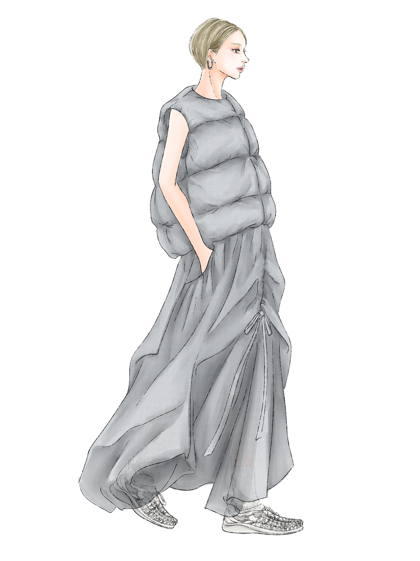日常と向き合うポジティブな力を蓄える。大胆でありながら軽やかに、冬をエアリーに楽しむセットスタイル。