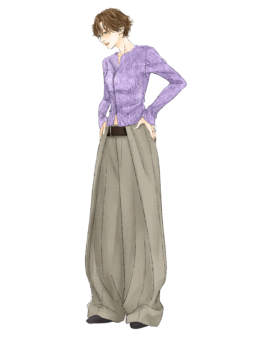 深いタックと下に広がるボリュームを持ったバギーパンツはドレス感や存在感もあり、カジュアルとフォーマルの両立が可能に。たっぷりと用尺をとるデザインにはドレーピーなアセテート混の薄地を使用してやりすぎないシルエットと蒸れない快適性を。