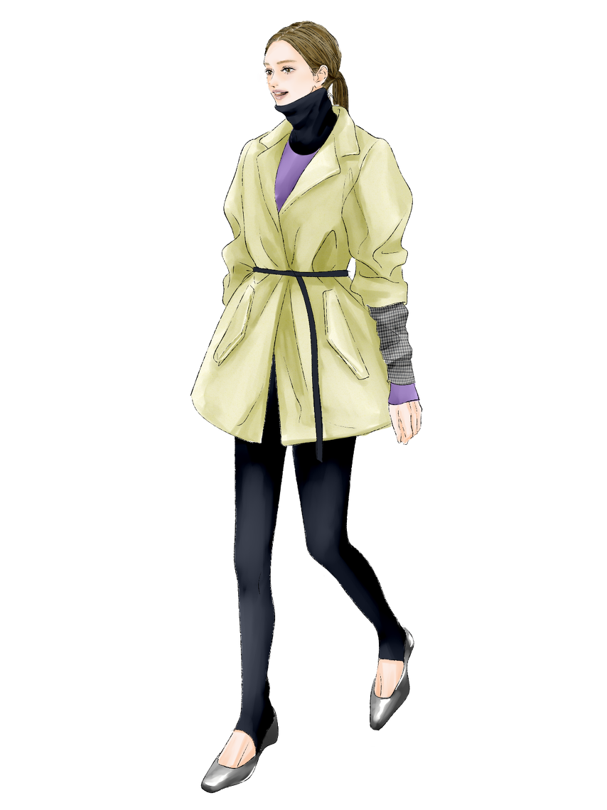 「装いのためのコート」としてドレスのように仕立てられたワンピースコートは非日常感を演出するキーアイテム。通常のミニワンピースに比べて重厚感がありながら、一般的なコートよりも軽やかに仕上がるよう、素材は、柔らかさ、構築性、軽さを備えたニードルジャージーで、体のラインを美しく見せるしなやかなフォルム性と動きに寄り添う快適さを両立させました。さらに、軽快さをもたらすレギンスを合わせることで、着やすさと防寒性を兼ね備えたスタイルに。