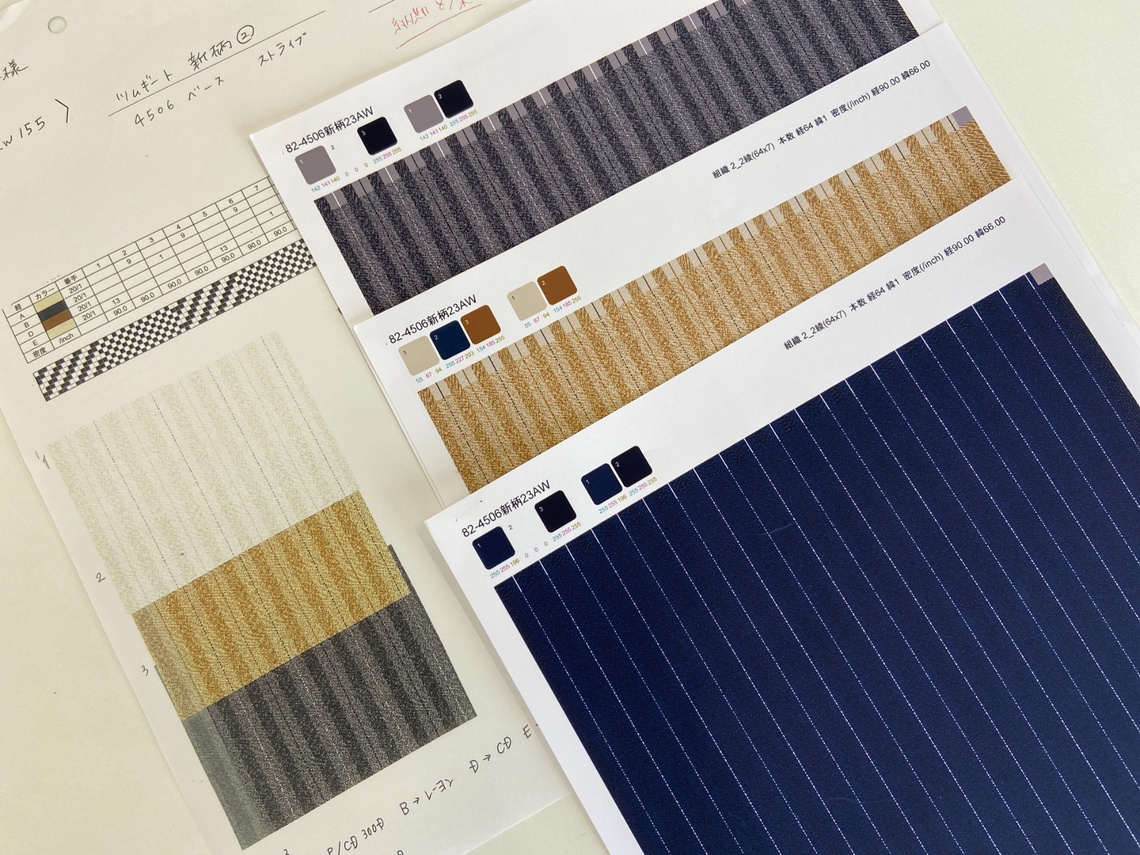 タキサダナゴヤには、約1万点の中世~現代までのテキスタイルアーカイブが保存されています。中には今はもう作ることが出来ないものも含まれる、貴重な資料です。そのアーカイブの中から、色褪せることなく今私たちが取り入れても素敵!!と思う物を選び分析、その情報を元に、全く同じものを再現するのではなく、82課が得意とする合繊ベースのツムギートシリーズへ作り替えていきます。