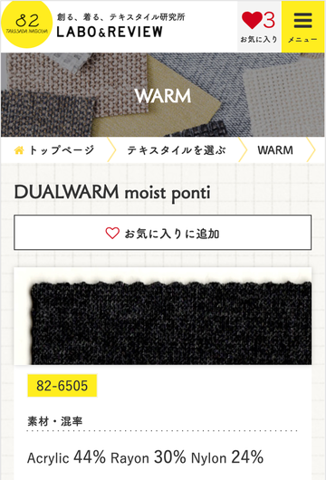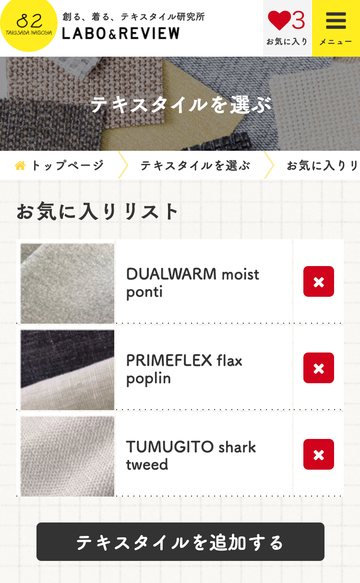 興味を持たれたテキスタイルがありましたら、ページ上段、または中段にあります「♡お気に入りリストに追加」ボタンを押して、お気に入りに追加します。