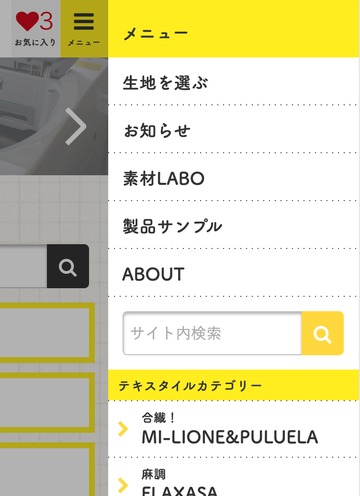ページ上段メニュー「生地を選ぶ」より、テキスタイルを検索してください。