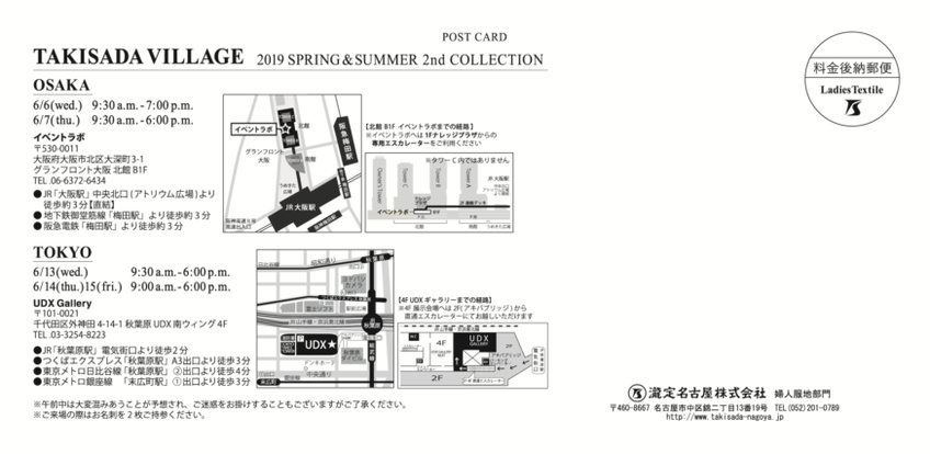 201805/23 展示会のお知らせ 2019 SPRING & SUMMER 2nd COLLECTION 19SS 2nd展のお知らせです。今回は各課の個性を出した課別展示となっております。 ☆大阪:6/6/(wed.) 9:30-19:00 6/7(thu.) 9:30-18:00 会場:グランフロント大阪 北乾B1F イベントラボ ☆東京:6/13(wed.) 9:30-18:00 6/14-15(thu.-fri.)9:00-18:00 会場:秋葉原UDX 4F UDX Gallery 皆様ぜひ足をお運びください!心よりお待ち申し上げております!! ※会場にお越しの際は、担当営業までご一報ください。