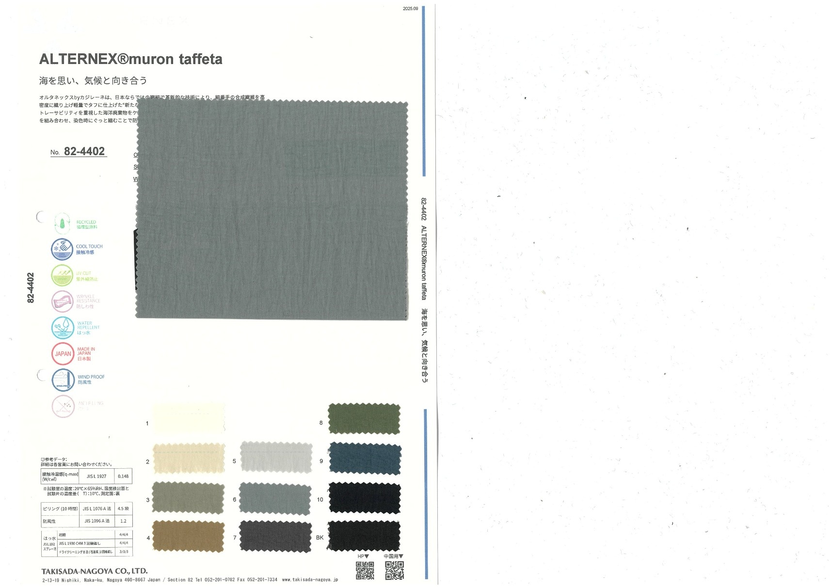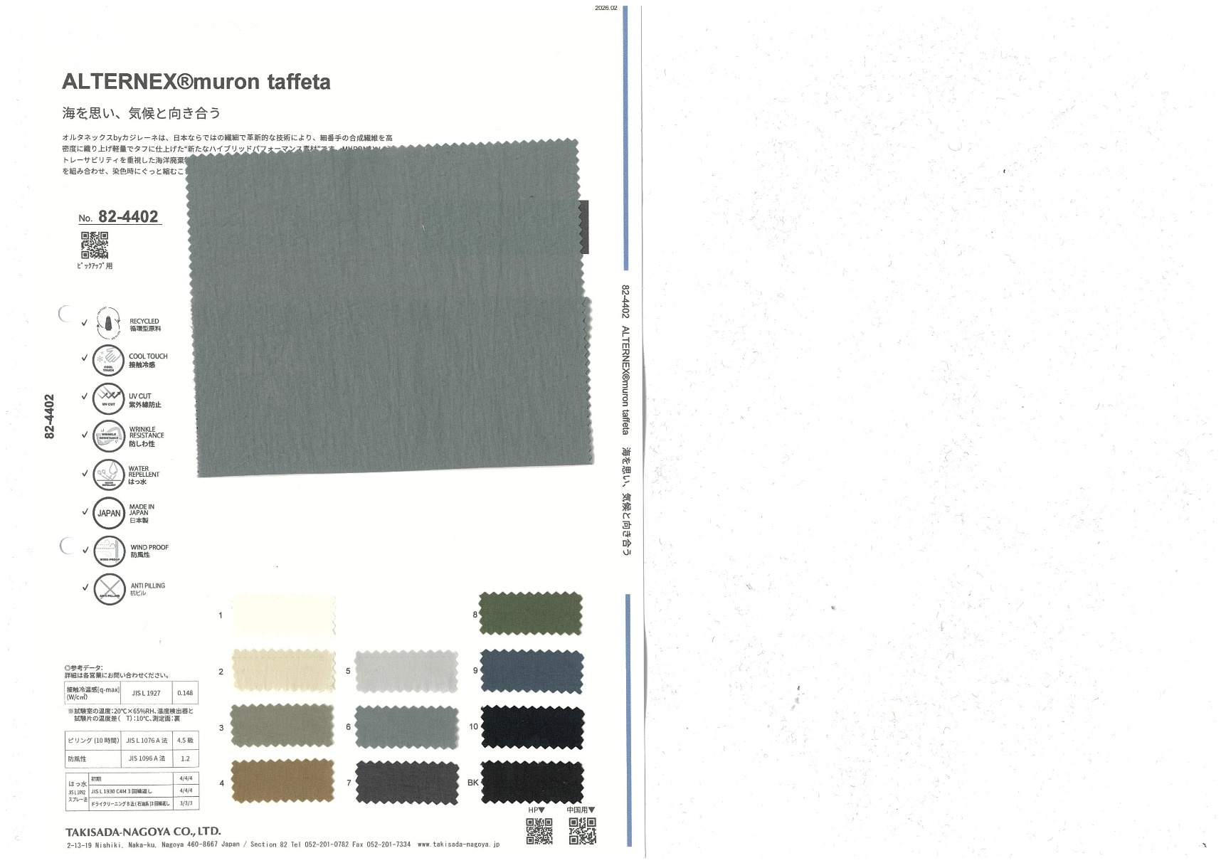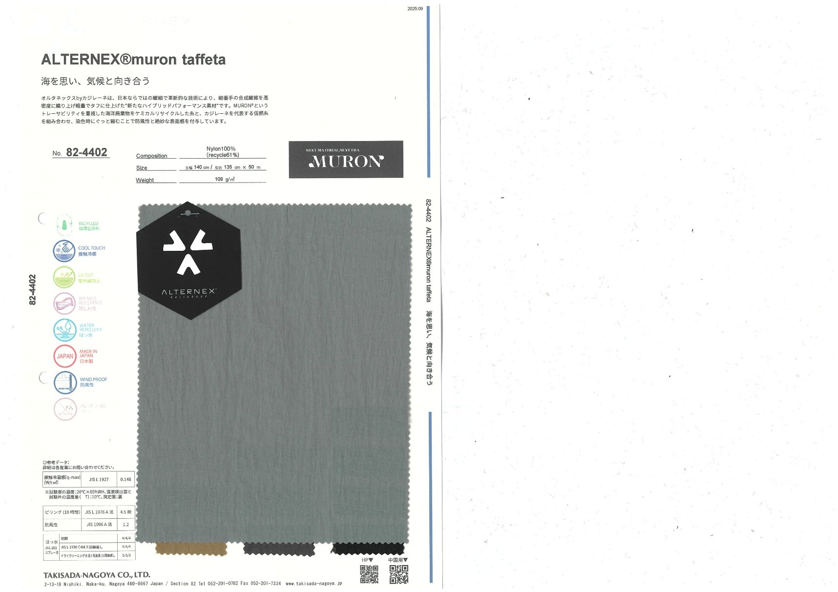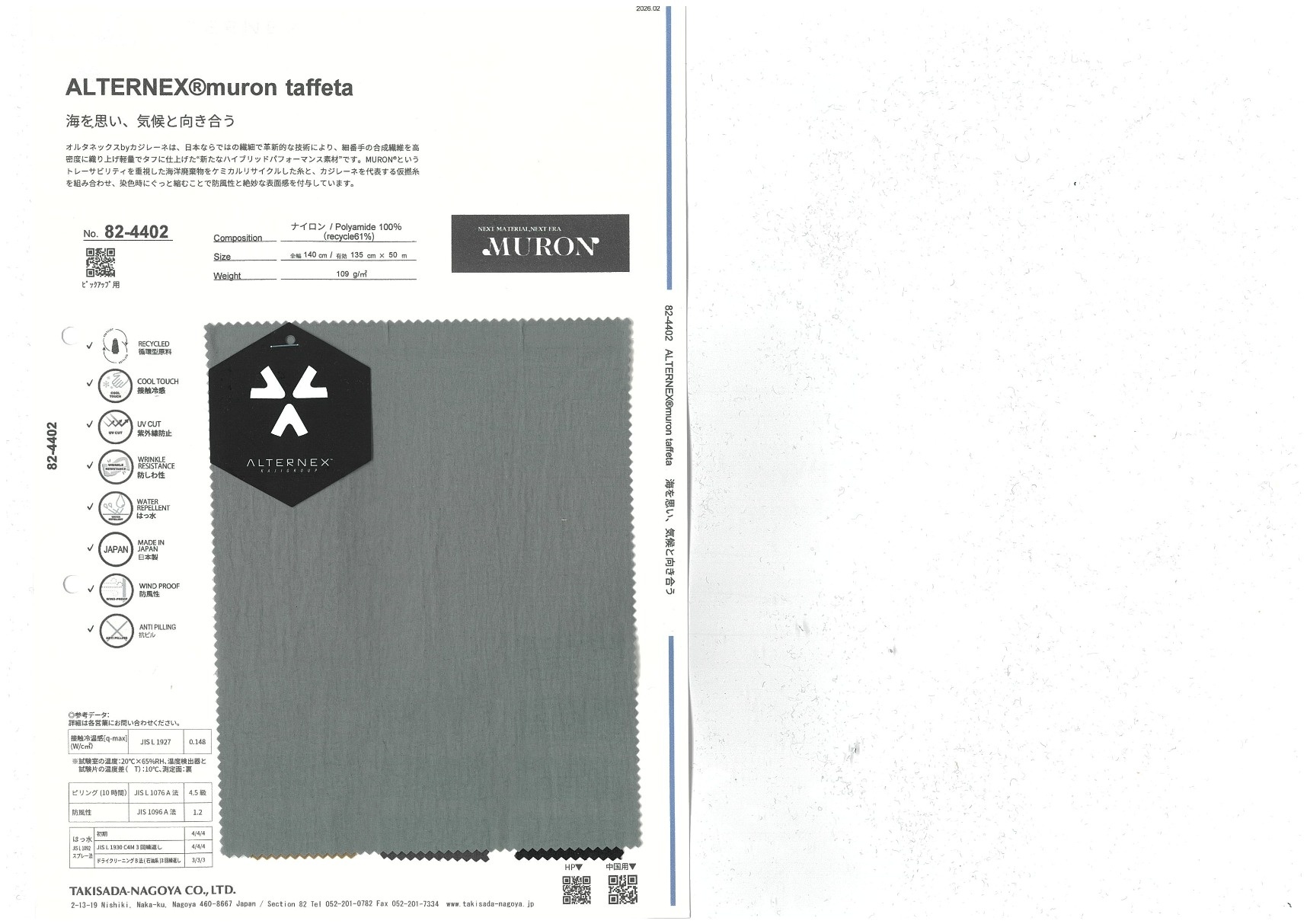 オルタネックスbyカジレーネは、日本ならではの繊細で革新的な技術により、細番手の合成繊維を高密度に織り上げ軽量でタフに仕上げた“新たなハイブリッドパフォーマンス素材”です。MURON®というトレーサビリティを重視した海洋廃棄物をケミカルリサイクルした糸と、カジレーネを代表する仮撚糸を組み合わせ、染色時にぐっと縮むことで防風性と絶妙な表面感を付与しています。