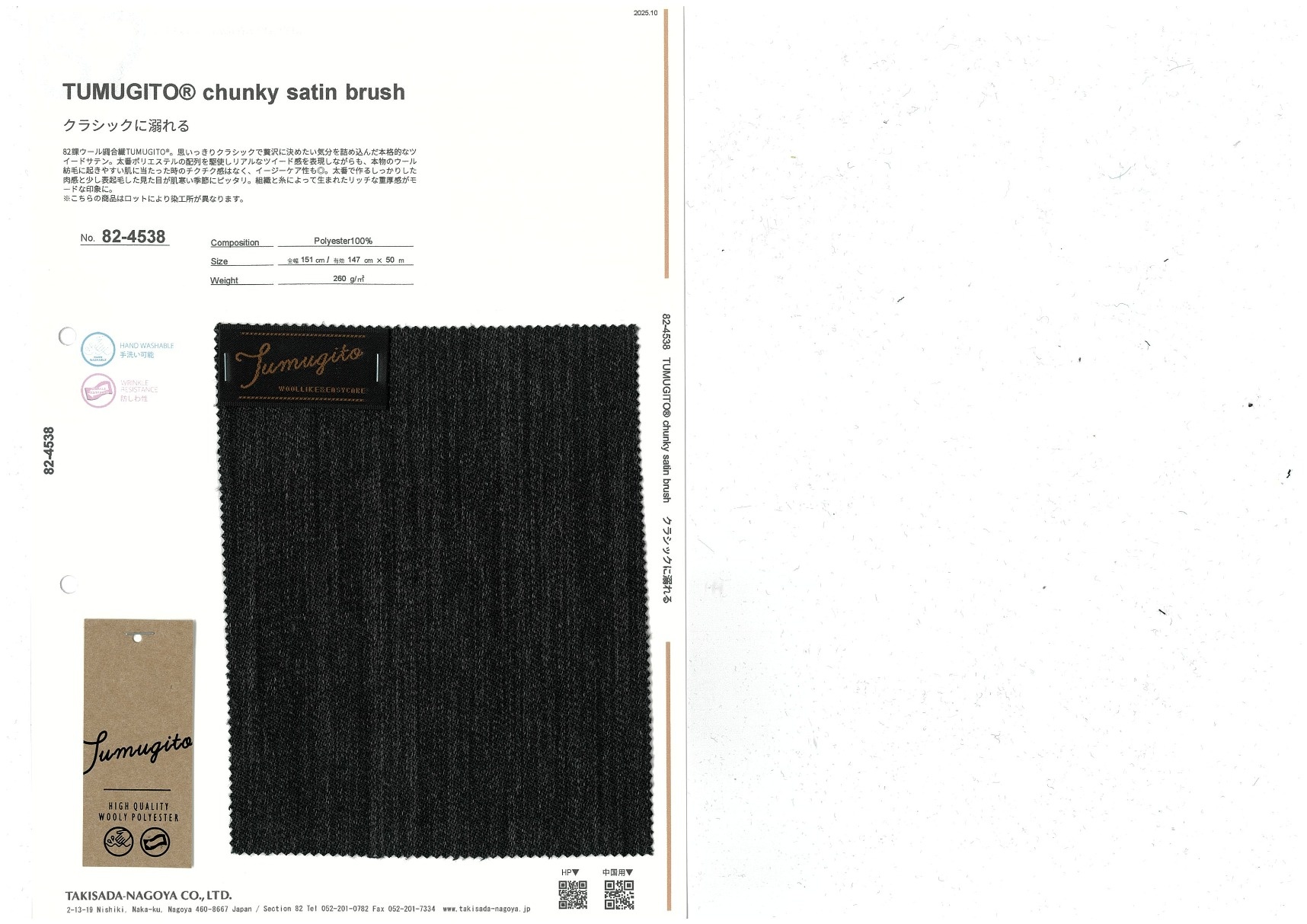 82課ウール調合繊TUMUGITO®。思いっきりクラシックで贅沢に決めたい気分を詰め込んだ本格的なツイードサテン。太番ポリエステルの配列を駆使しリアルなツイード感を表現しながらも、本物のウール紡毛に起きやすい肌に当たった時のチクチク感はなく、イージーケア性も◎。太番で作るしっかりした肉感と少し表起毛した見た目が肌寒い季節にピッタリ。組織と糸によって生まれたリッチな重厚感がモードな印象に。