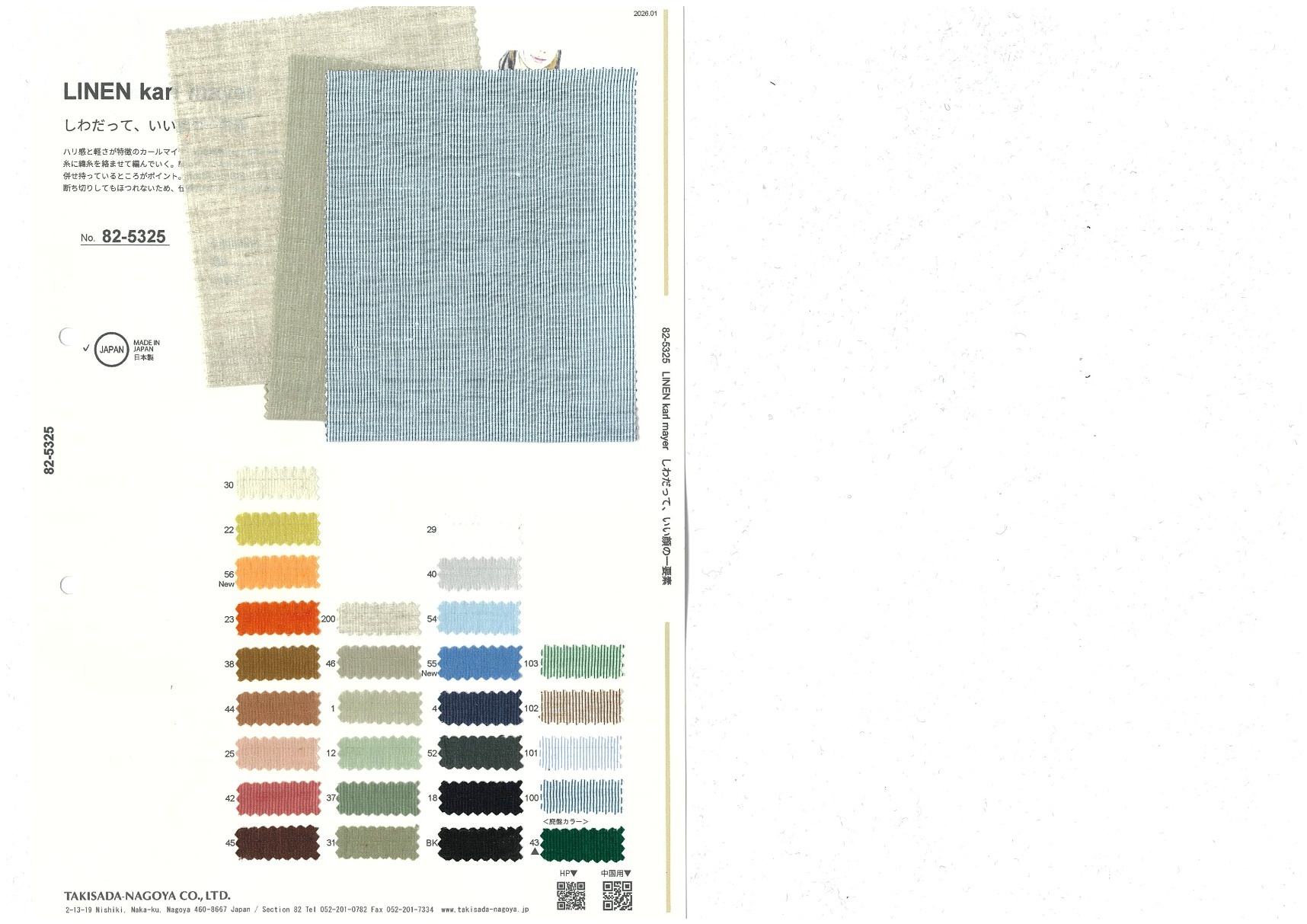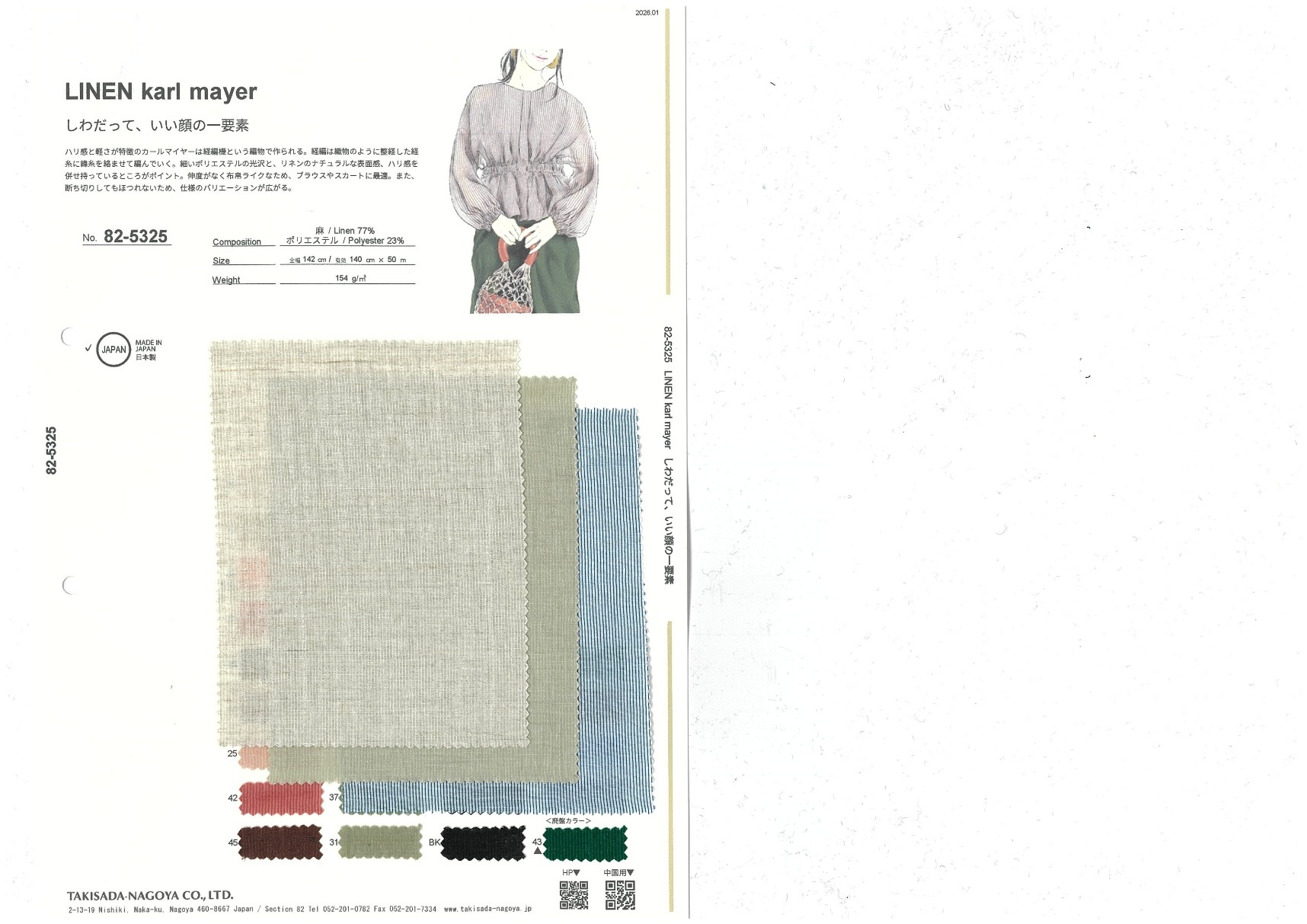 ハリ感と軽さが特徴のカールマイヤーは経編機という編物で作られる。織物のように整経した経糸のポリエステルに、ヨコ糸のリネンを絡ませて編んでいく。伸度がなく布帛ライクなため、ブラウスやスカートに最適。また、断ち切りしてもほつれないため、仕様のバリエーションが広がる。