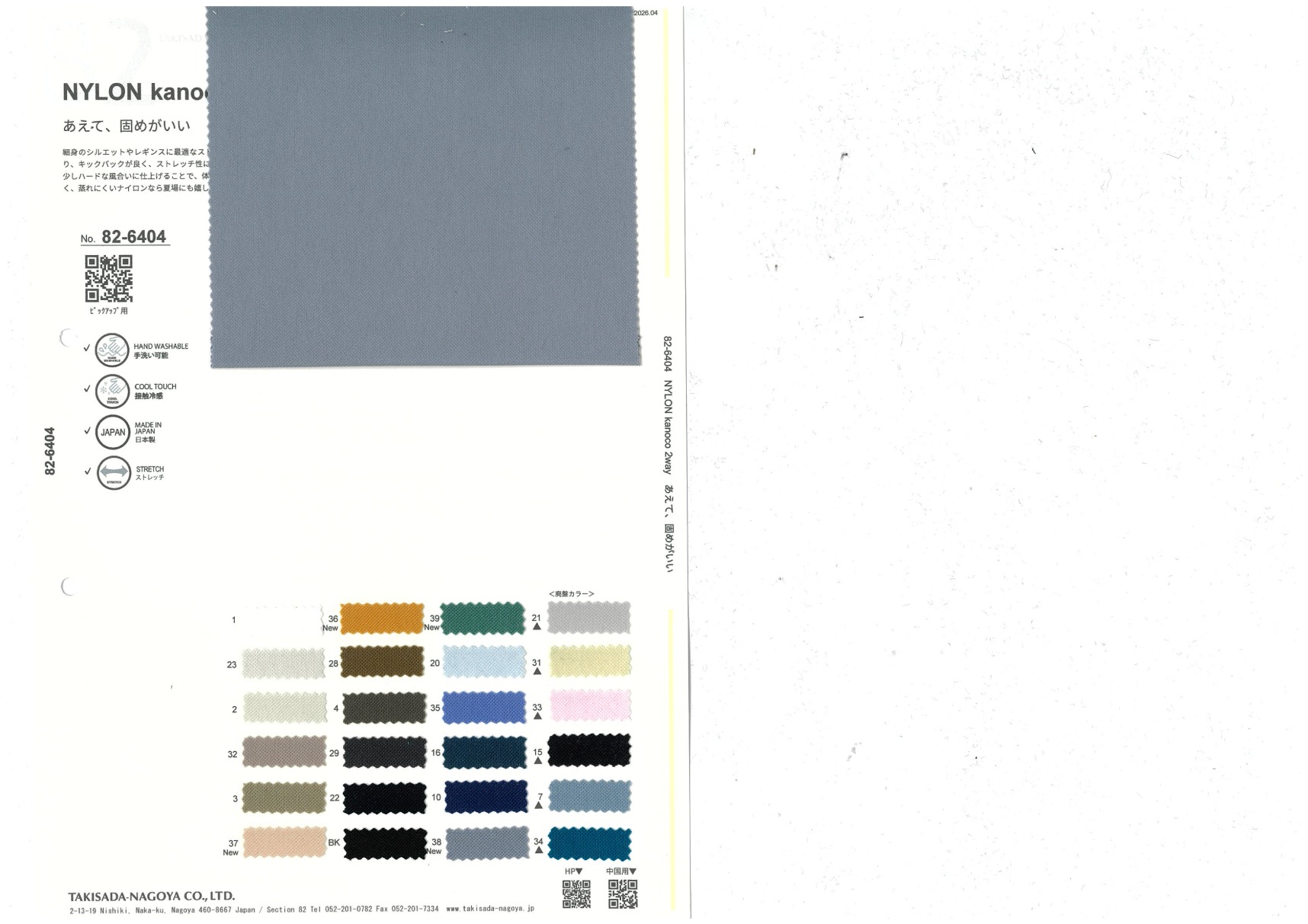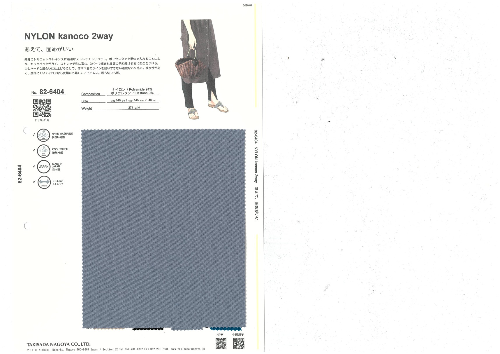 細身のシルエットやレギンスに最適なストレッチトリコット。ポリウレタンを単体で入れることにより、キックバックが良く、ストレッチ性に富む。3バーで編まれる鹿の子組織は表面に凹凸をつける。少しハードな風合いに仕上げることで、体や下着のラインを拾いすぎない適度なハリ感に。吸水性が高く、蒸れにくいナイロンなら夏場にも嬉しいアイテムに。断ち切りも可。