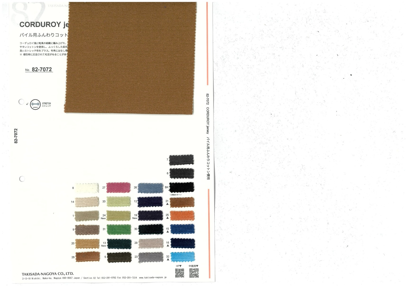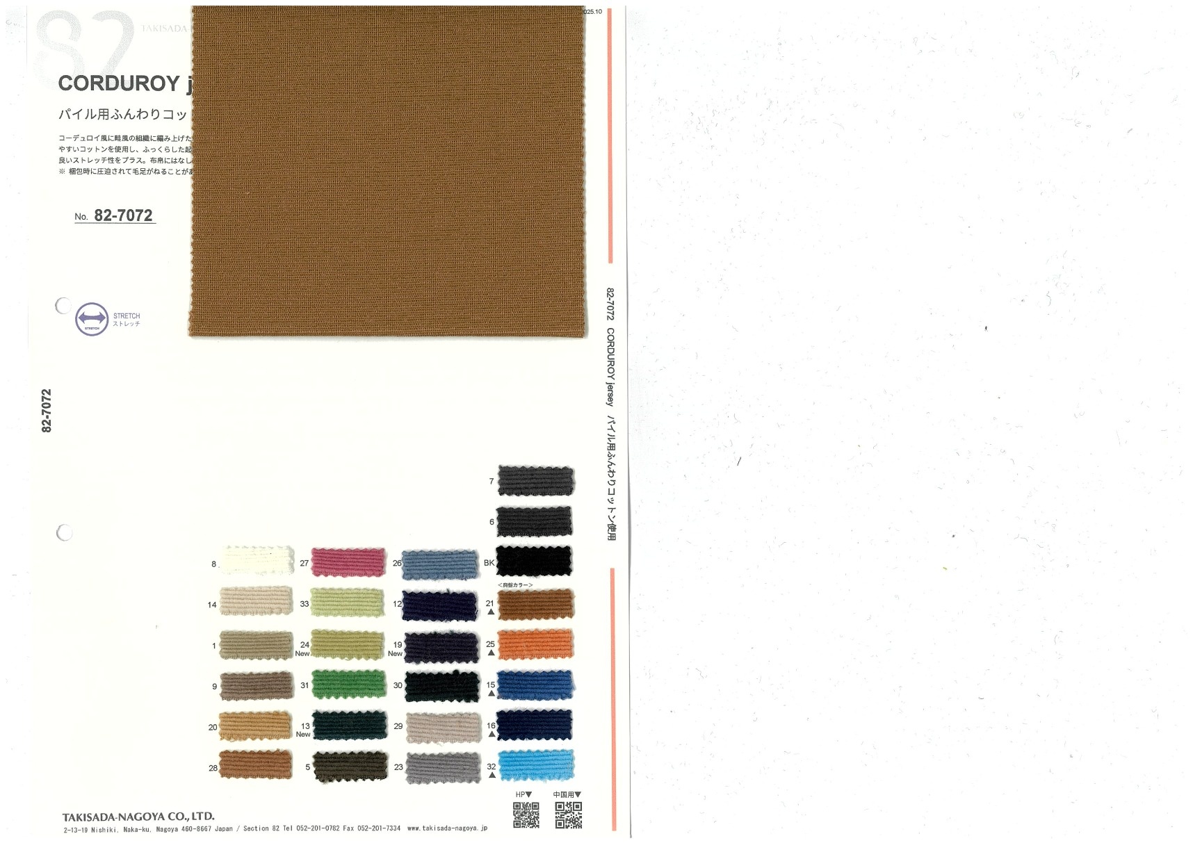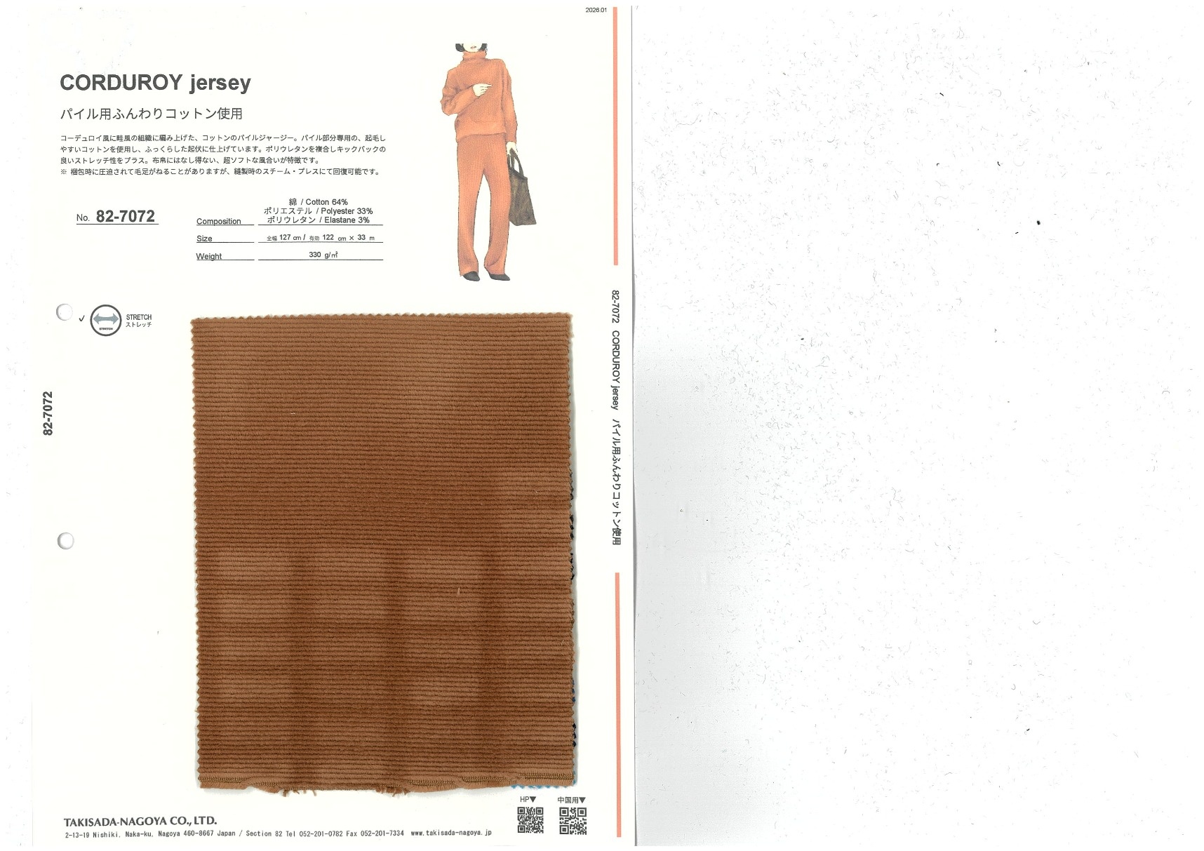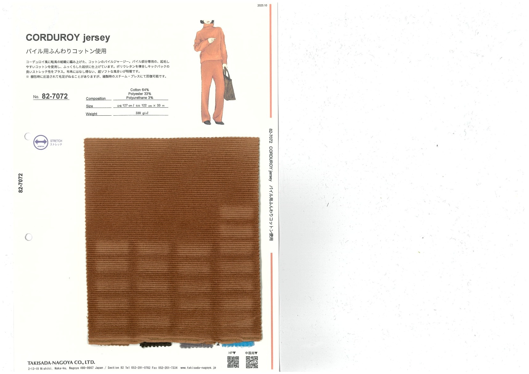 コーデュロイ風に畦風の組織に編み上げた、コットンのパイルジャージー。パイル部分専用の、起毛しやすいコットンを使用し、ふっくらした起状に仕上げています。ポリウレタンを複合しキックバックの良いストレッチ性をプラス。布帛にはなし得ない、超ソフトな風合いが特徴です。