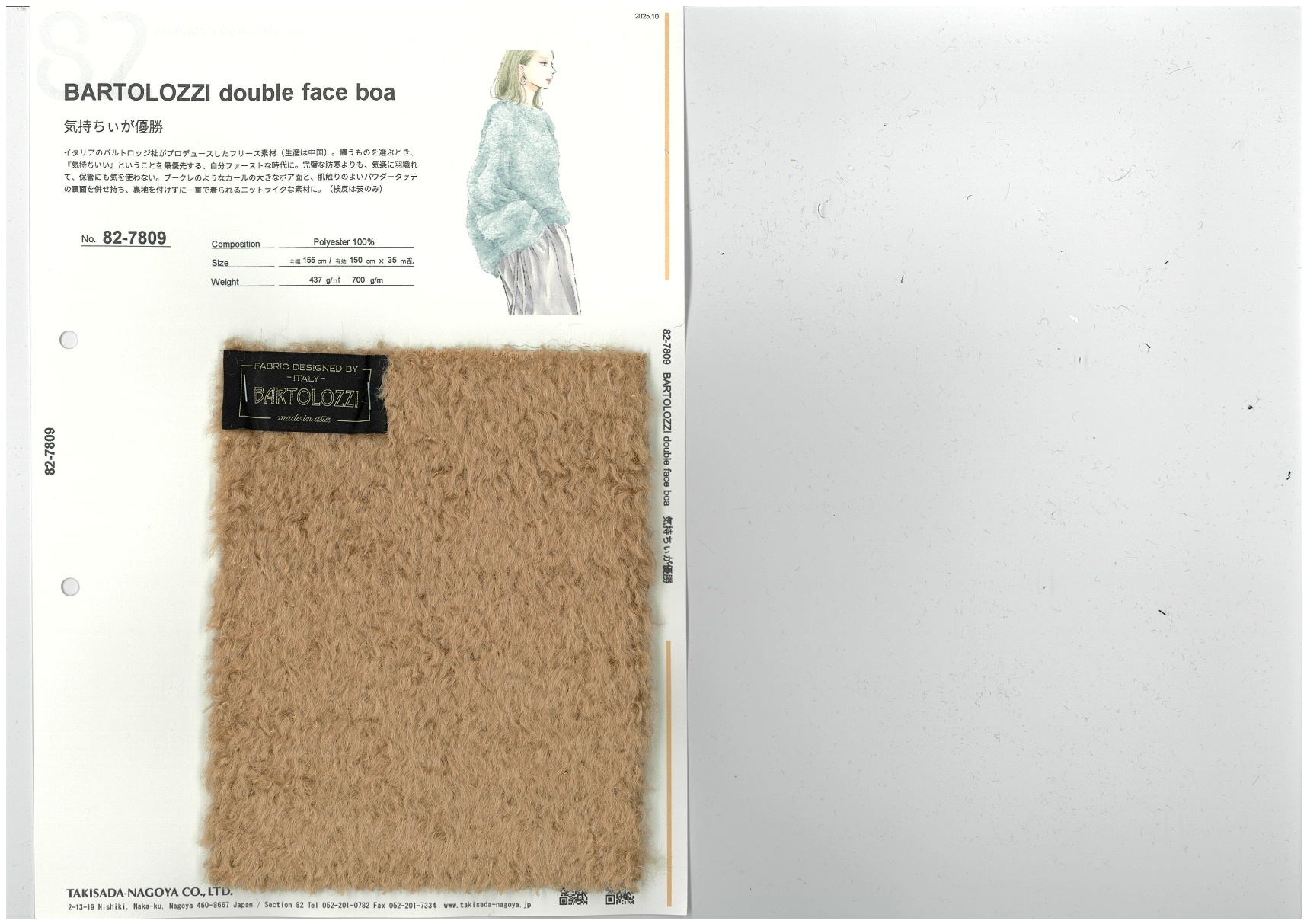 イタリアのバルトロッジ社がプロデュースしたフリース素材(生産は中国)。纏うものを選ぶとき、『気持ちいい』ということを最優先する、自分ファーストな時代に。完璧な防寒よりも、気楽に羽織れて、保管にも気を使わない。ブークレのようなカールの大きなボア面と、肌触りのよいパウダータッチの裏面を併せ持ち、裏地を付けずに一重で着られるニットライクな素材に。(検反は表のみ)