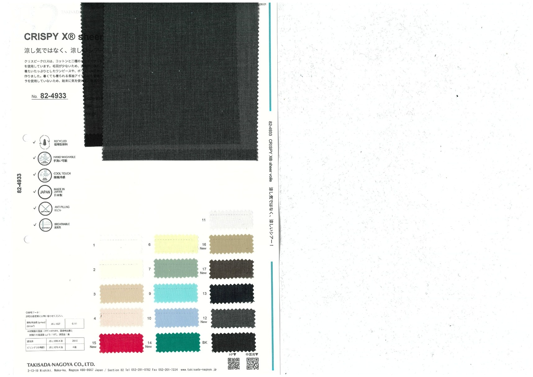 クリスピークロスは、コットンと二種のポリエステルを合わせて特殊な方法で強撚しながら紡績した糸を使用しています。夏に着たいたっぷりとしたワンピースや、ボリュームのあるシャツ、ブラウスなどに向けてシアーボイルを作りました。暑くても着られる長袖アイテムにも最適です。また、シアー素材に使われがちなモノフィラを使用していないため、始末に気を使わず、簡易な仕様が可能です。