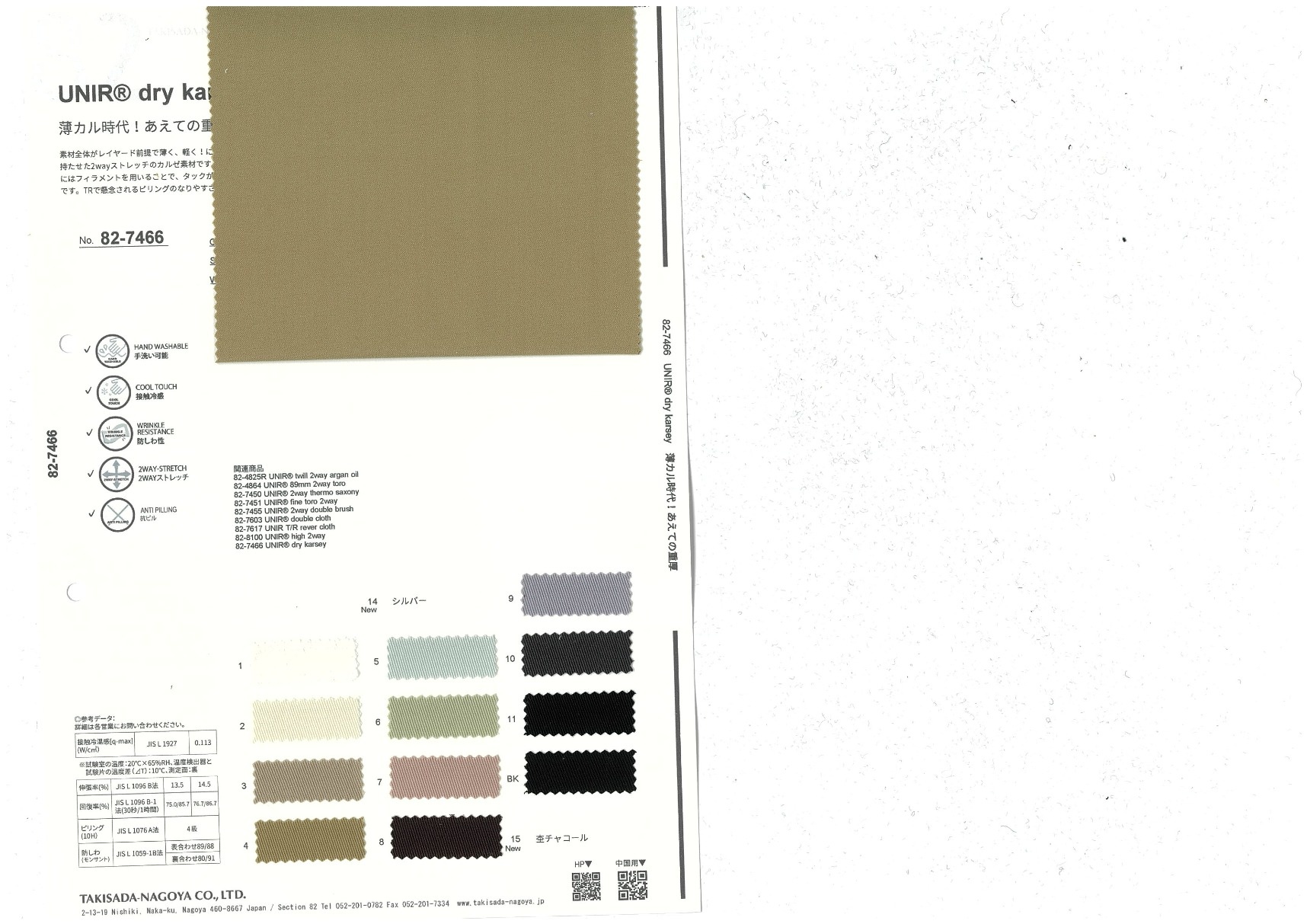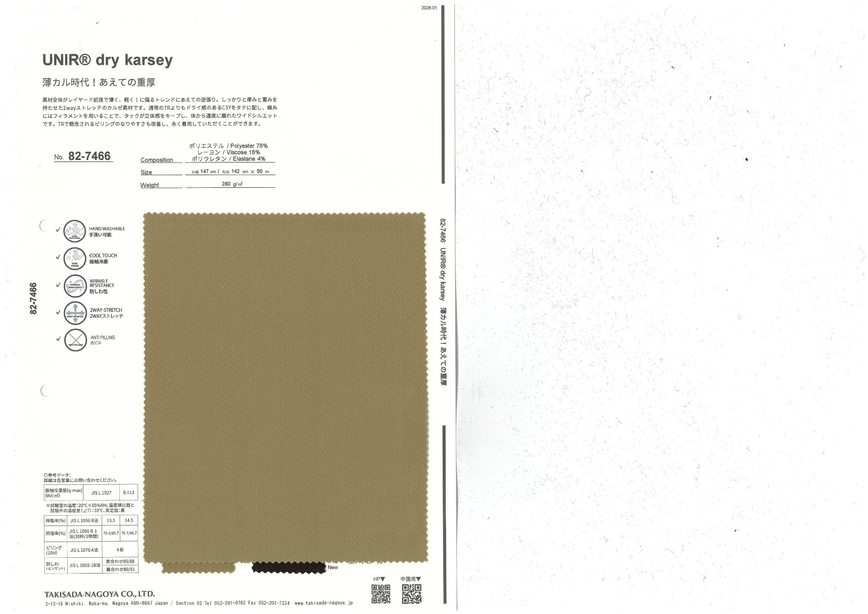 素材全体がレイヤード前提で薄く、軽く!に偏るトレンドにあえての逆張り。しっかりと厚みと重みを持たせた2wayストレッチのカルゼ素材です。通常のTRよりもドライ感のあるCSYをタテに配し、緯糸にはフィラメントを用いることで、タックが立体感をキープし、体から適度に離れたワイドシルエットです。TRで懸念されるピリングのなりやすさも改善し、永く着用していただくことができます。