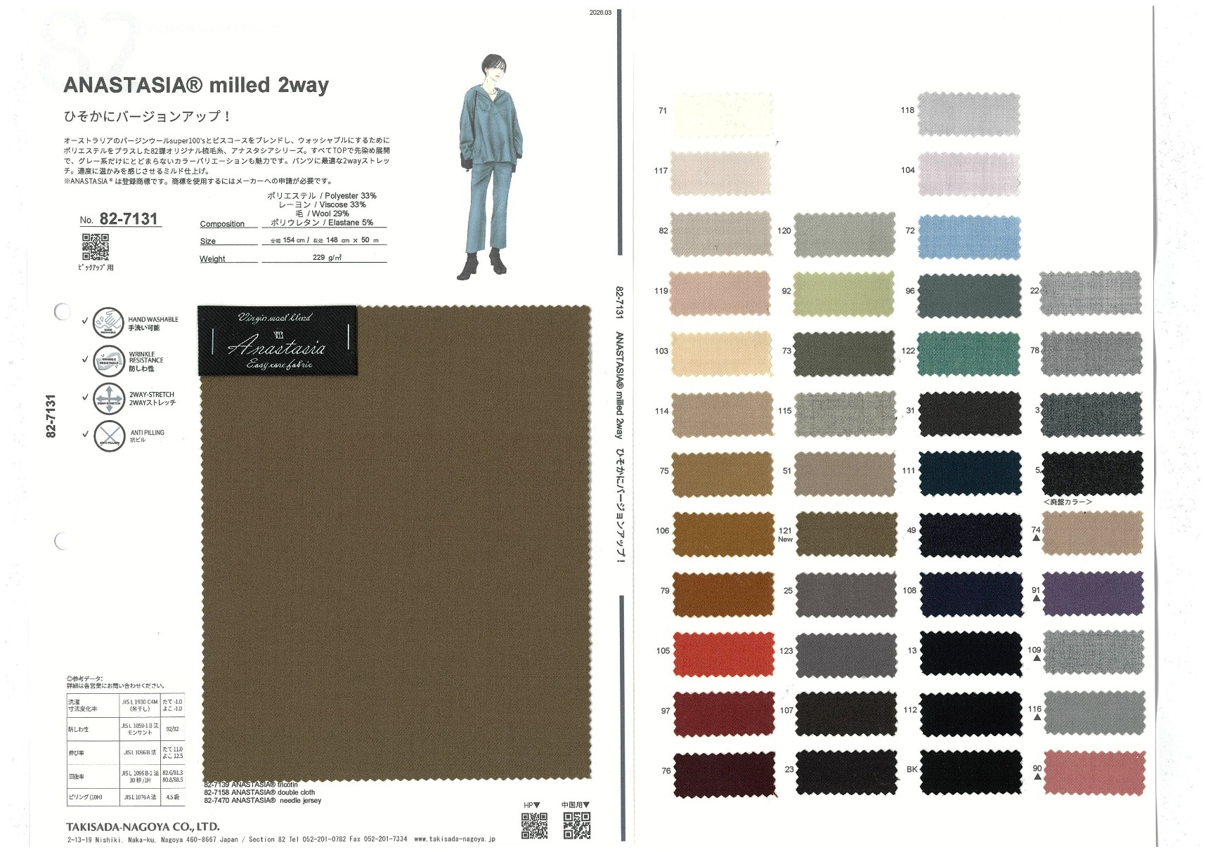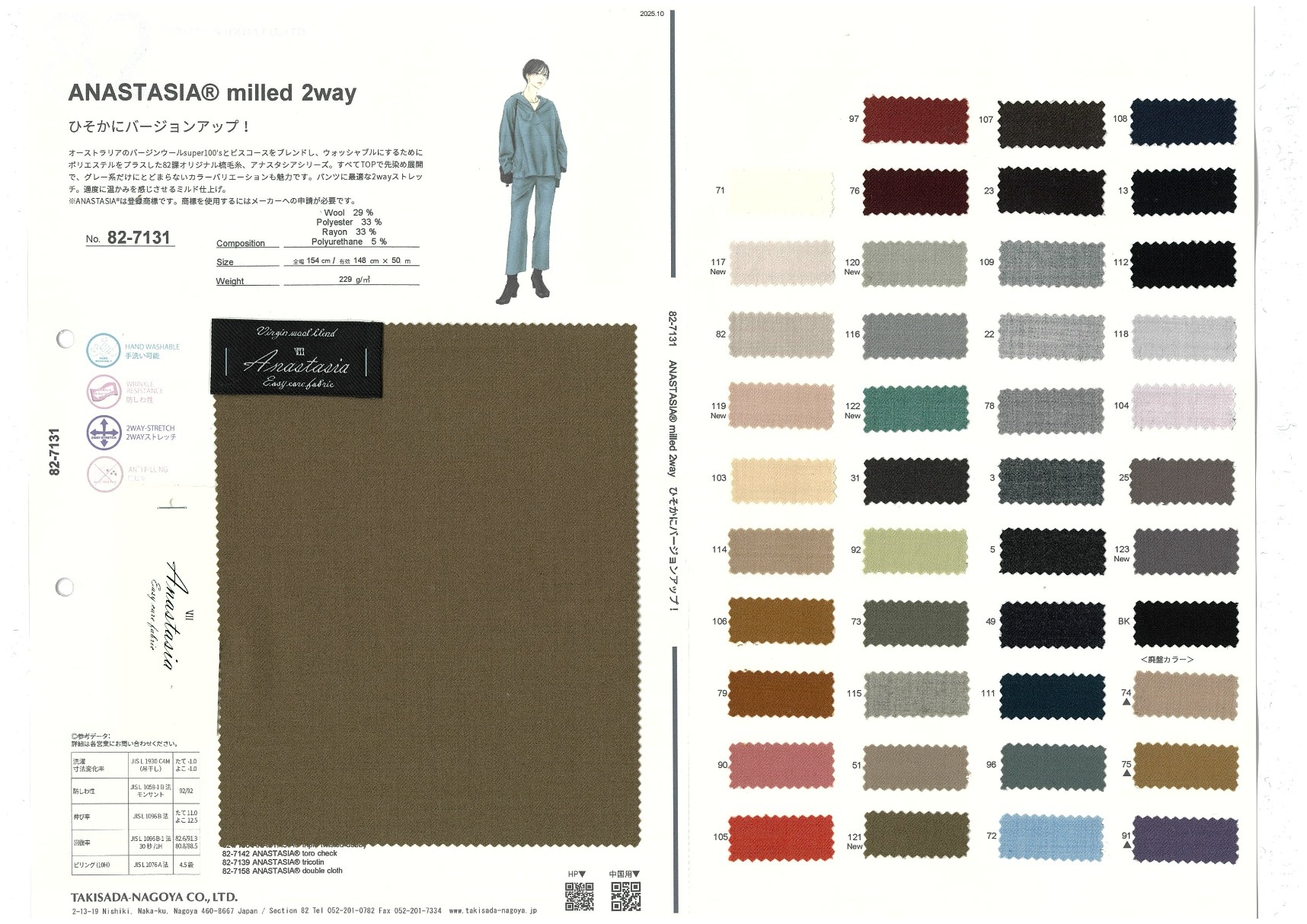 オーストラリアのバージンウールsuper100'sとビスコースをブレンドし、ウォッシャブルにするためにポリエステルをプラスした82課オリジナル梳毛糸、アナスタシアシリーズ。すべてTOPで先染め展開で、グレー系だけにとどまらないカラーバリエーションも魅力です。パンツに最適な2wayストレッチ。適度に温かみを感じさせるミルド仕上げ。※ANASTASIA®は登録商標です。商標を使用するにはメーカーへの申請が必要です。