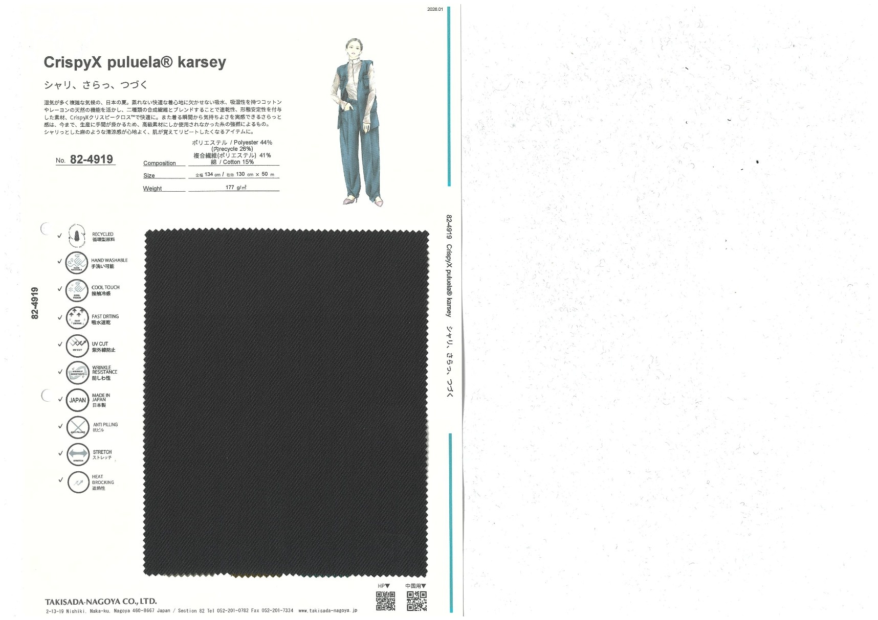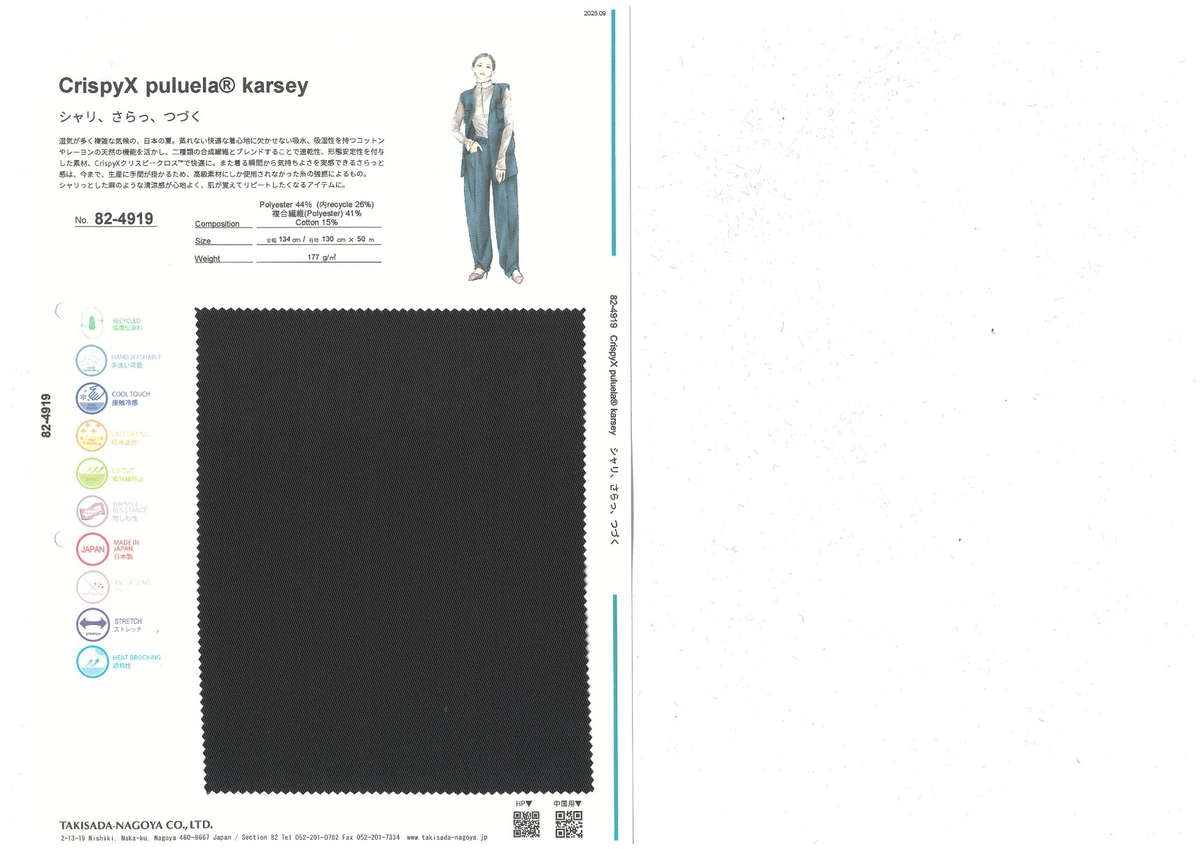 コットンでスラックスを。カジュアルでメンズライクになりがちなコットンボトムのイメージを一変する女性らしいスラックスをイメージして。二種類のポリエステルとコットンをブレンドし、特殊な技術で紡績と同時に強撚することで、シャリさらっな風合いに。また二種類の原綿の断面形状を変えることで強撚しても柔らかく、多機能を付与。混紡糸で心配なピリングにもなりにくい。
