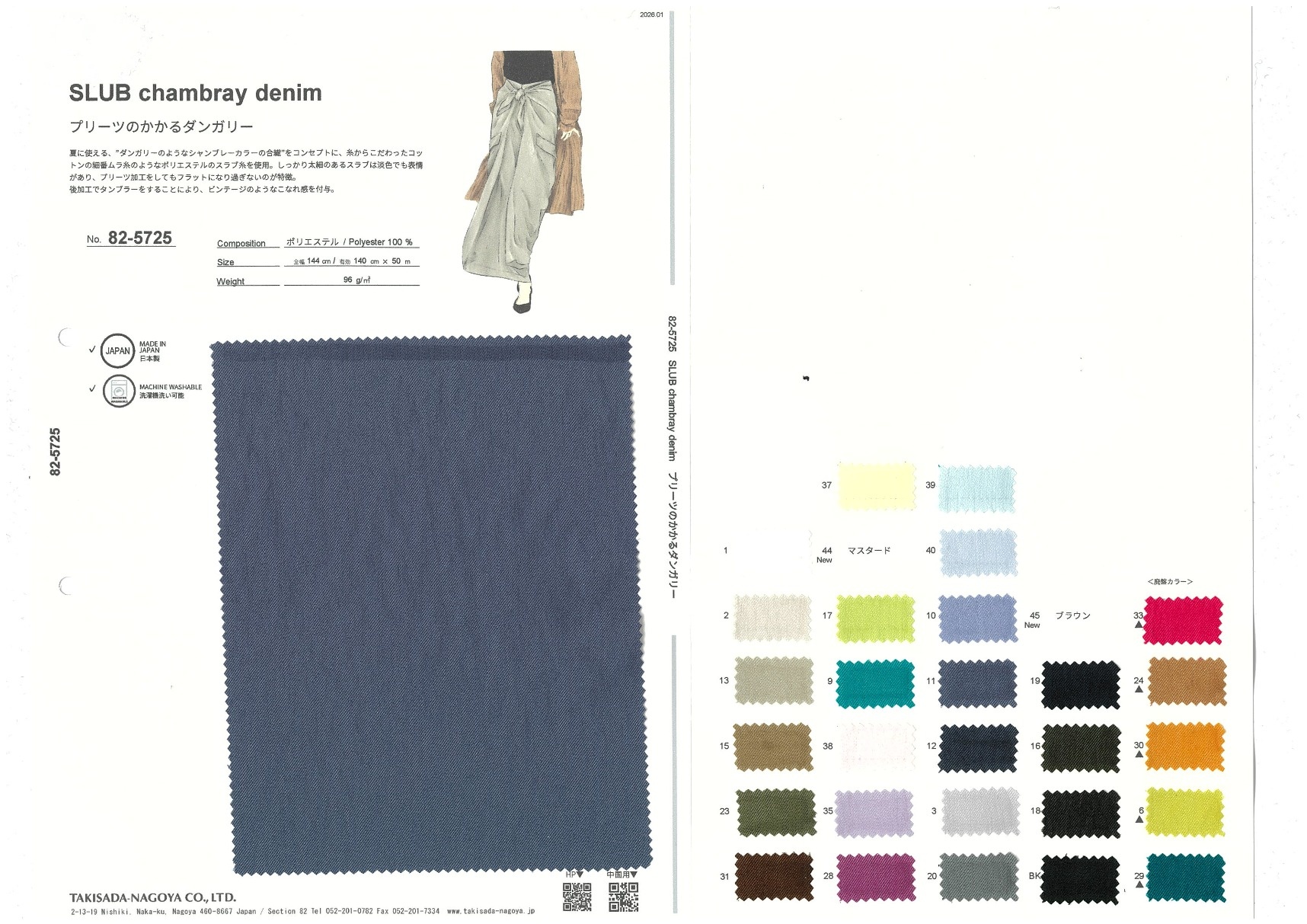 夏に使える、ダンガリーのようなシャンブレーカラーの合繊をコンセプトに、糸からこだわったコットンの細番ムラ糸のようなポリエステルのスラブ糸を使用。しっかり太細のあるスラブは淡色でも表情があり、プリーツ加工をしてもフラットになり過ぎないのが特徴。後加工でタンブラーをすることにより、ビンテージのようなこなれ感を付与。
