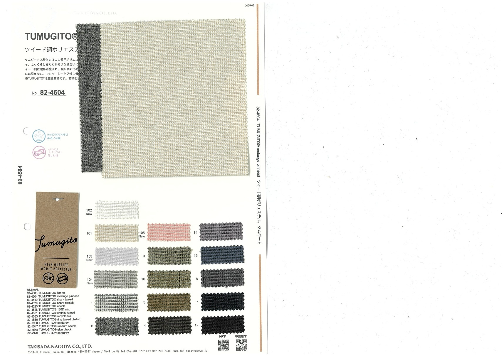 ツムギートは秋冬向けの太番手ポリエステルシリーズ。この素材は糸自体が膨らみを持ち、ふっくらとあたたかそうな風合いに仕上げました。シックアンドシーンのため、カラーリングはツィード調に陰影が生まれ、見た目にも秋冬のコーディネートに溶け込みます。一見ポリエステル100%に見えない、でもイージーケア性に優れた新素材です。