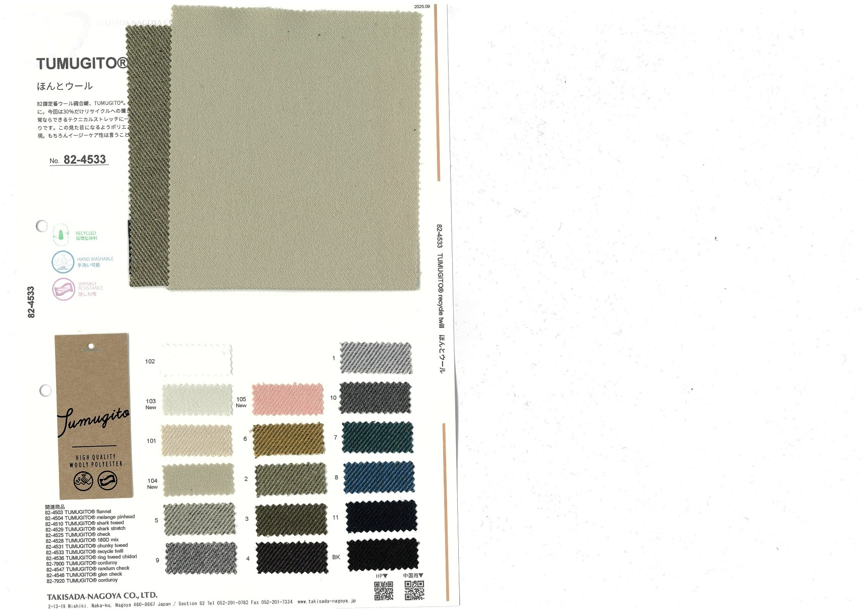 82課定番ウール調合繊、TUMUGITO®。ポリエステルもここまで来たか!と思わせるの見た目と風合いに。今回は30%だけリサイクルへの置き換えにも挑戦。リサイクル糸は元の糸よりも膨らみが弱く通常ならできるテクニカルストレッチに一苦労。何回も失敗を繰り返しながらたどり着いた最高の仕上がりです。この見た目になるようポリエステル100%と言えど3種類の糸を使い深みのあるカラーを実現。もちろんイージーケア性は言うことなし。